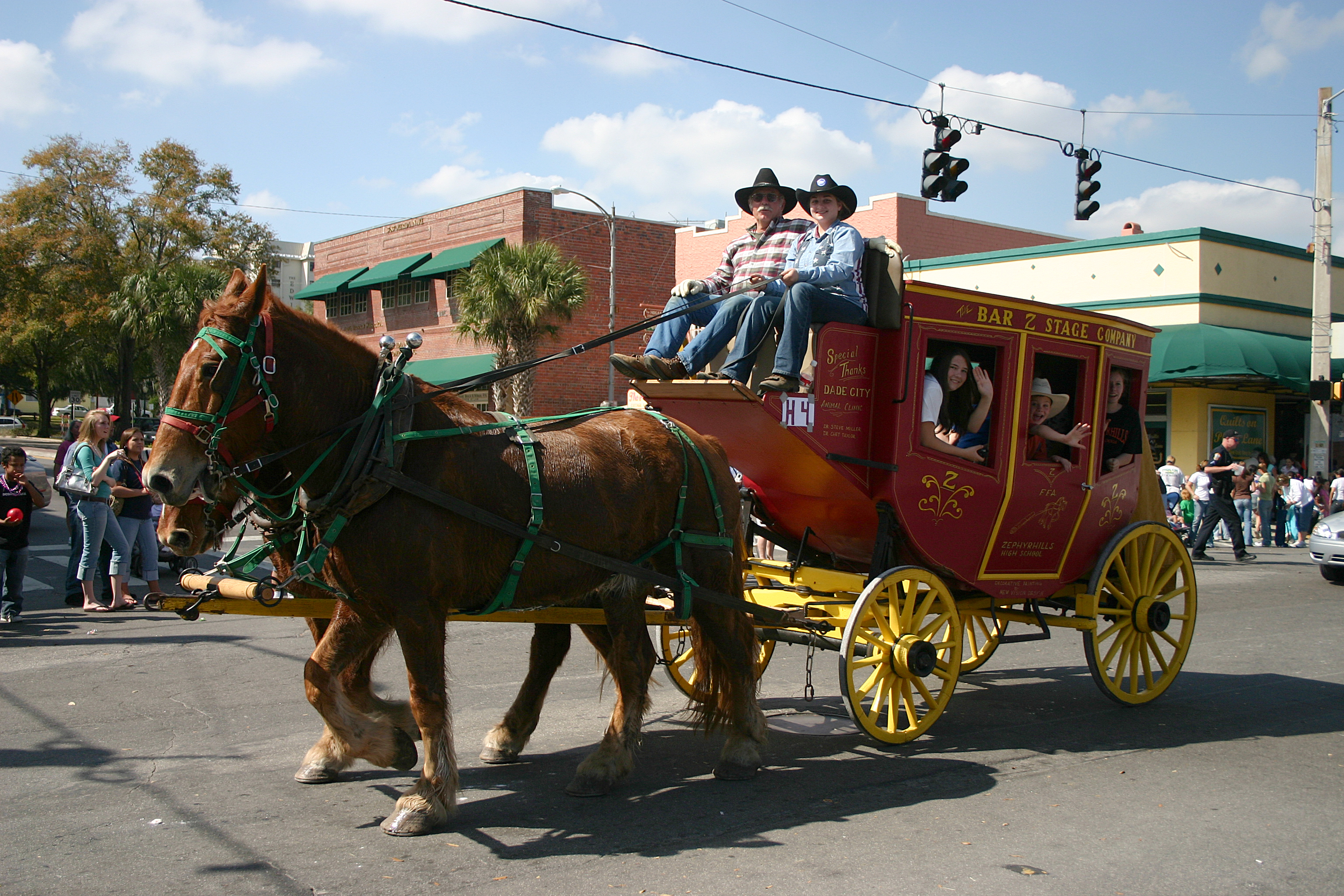 Speaking of learning skills and adaptability, He tells the story of driving the stagecoach at the Little Everglades Steeplechase that used to be held north of Dade City: “I had these old logging horses and when you first hitched them up, they wanted to pull, like they was pulling a log and you had to take 'em out somewhere and work the kinks out of 'em for about a half an hour before you went in the parade. Well, we went up there (Little Everglades Steeplechase) and we got on the stagecoach, ready for the parade. Too late, I realized one of the lines was wrapped around the horse collar, and so I had no control over 'em. They took off with us on the stagecoach straight for the lineup of several brand new Mercedes that were waiting to get in the parade. “Oh, I thought, we're gonna destroy these Mercedes with the stagecoach, and luckily for me, when the horses got up to the Mercedes, they just stopped dead. My girls, being horse girls, were used to working with horses. One of them brought up and grabbed the lines and got 'em untangled, and we didn't have any more accidents.”
