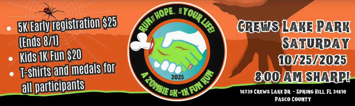 This year, the Hope for Run... and Your Life! event will take place in the beautiful Crews Lake Park, located off Shady Hills Road in Pasco County. Under the administration of Pasco County Parks, Recreation, and Natural Resources, Crews Lake Park boasts paved trails, hiking trails, athletic fields, playgrounds, and beautiful mature nature all around, making it the most desirable venue for the event.